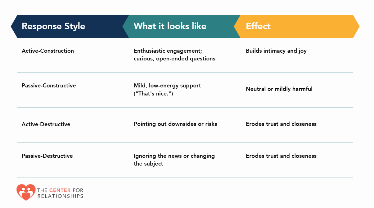 Research by Dr. Shelly Gable shows that how we respond to each other's good news is one of the strongest predictors of relationship satisfaction — even more so than how we respond during conflict. Gable identified four response styles, and only one actually strengthens the bond: